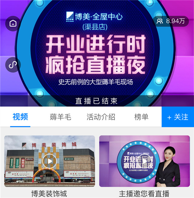 为本次开业运动预热,,,,,,,早在2020年4月20日,,,,,,,博美﹒全屋中心(渠县店)举行了首场开业直播,,,,,,,直播现场设置多项运动环节,,,,,,,分享有礼、集赞有礼、薅羊毛运动等,,,,,,,极大的提高了疫情时代的消耗流量。。。。。。。。据不完全统计,,,,,,,本次“开业举行时、疯抢直播夜”直播运动辐射人群快要9万人,,,,,,,为博美装饰城在更具消耗潜力的三四线市场翻开了影响力。。。。。。。。