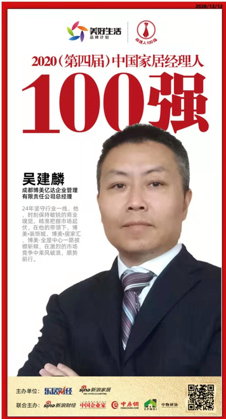 由乐居财经、新浪家居主理、新浪财经、中国企业家、中房网、中物研协团结主理的“行稳致远—2020(第四届)中国家居司理人评选”,,,,,,最终百强名单也在当天盛典上正式揭晓。。。。。。博美商业连锁总司理吴建麟荣获2020中国家具司理人100强,,,,,,吴建麟总司理已一连三年获得“中国家具司理人100强”称呼。。。。。。