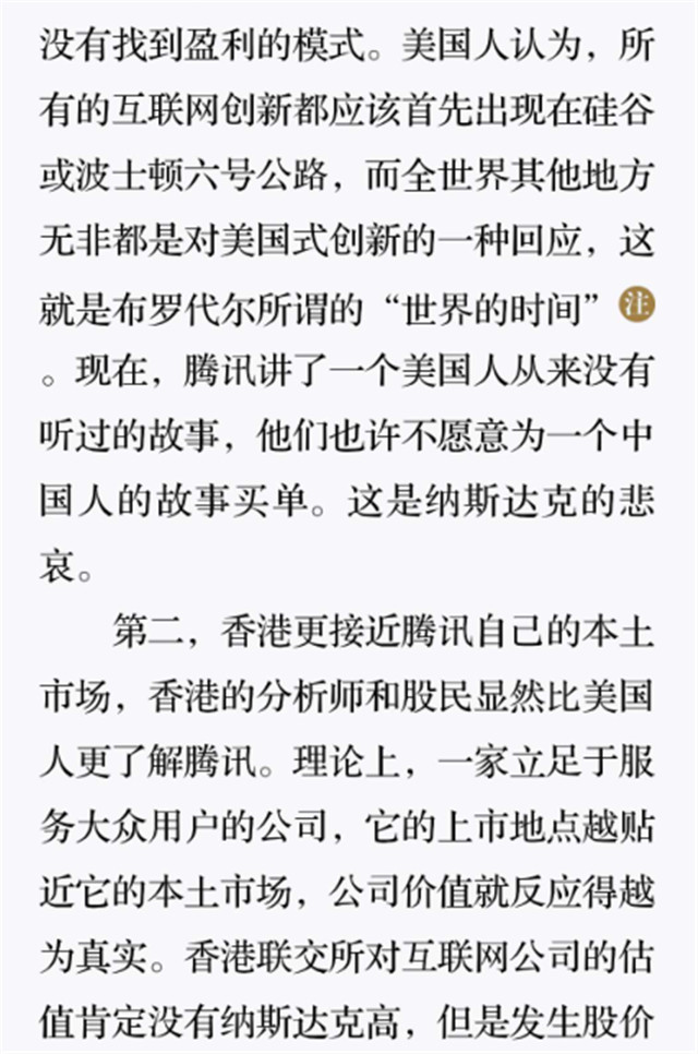 深读之后发明,,,,,,,着实全书真正的焦点在于透过腾讯可以视察到的中国企业逻辑,,,,,,,其中许多基于国情而降生的特殊能力,,,,,,,已往或受诟病或被追捧,,,,,,,而本书作者可以以越发客观的姿态对其举行剖析,,,,,,,这无疑是一种今世创业者和企业家应当学习的姿态和能力。。。。。。。