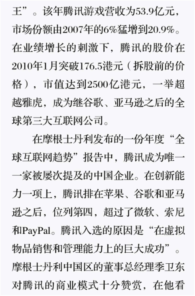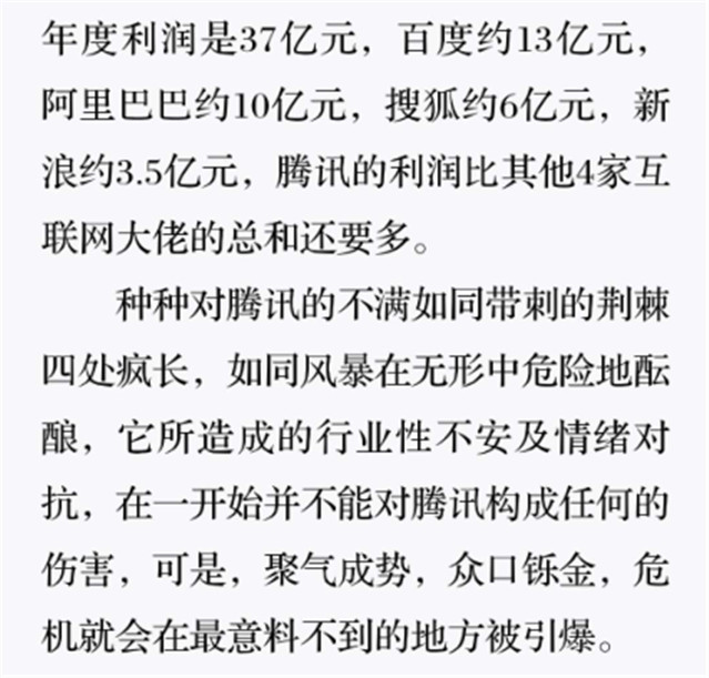 深读之后发明,,,,,,着实全书真正的焦点在于透过腾讯可以视察到的中国企业逻辑,,,,,,其中许多基于国情而降生的特殊能力,,,,,,已往或受诟病或被追捧,,,,,,而本书作者可以以越发客观的姿态对其举行剖析,,,,,,这无疑是一种今世创业者和企业家应当学习的姿态和能力。。。。。。。