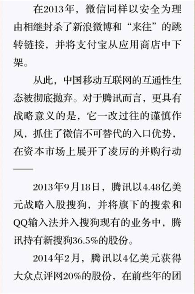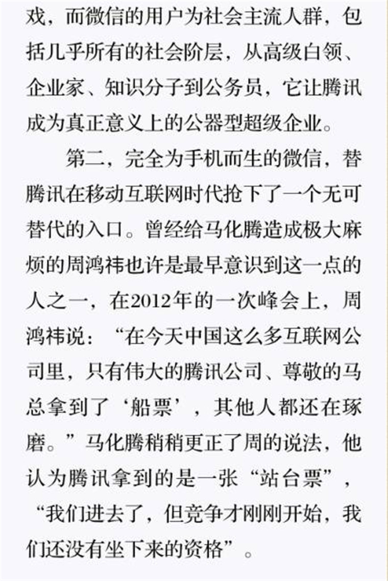 深读之后发明,,,,,,,着实全书真正的焦点在于透过腾讯可以视察到的中国企业逻辑,,,,,,,其中许多基于国情而降生的特殊能力,,,,,,,已往或受诟病或被追捧,,,,,,,而本书作者可以以越发客观的姿态对其举行剖析,,,,,,,这无疑是一种今世创业者和企业家应当学习的姿态和能力。。。。。。