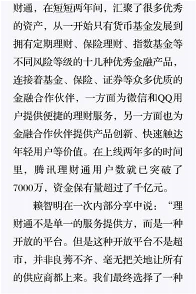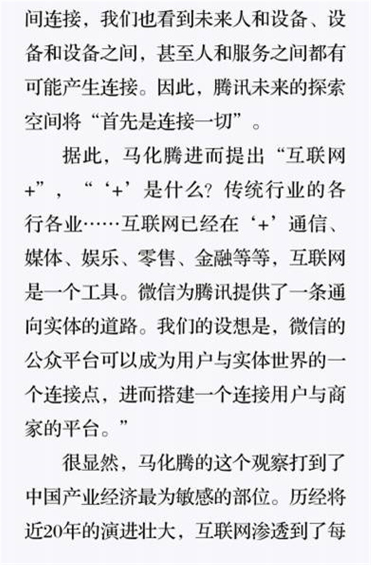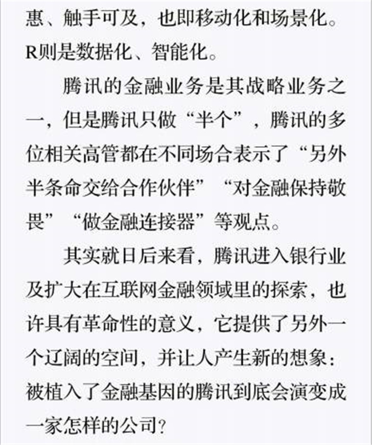 深读之后发明,,,,,,,着实全书真正的焦点在于透过腾讯可以视察到的中国企业逻辑,,,,,,,其中许多基于国情而降生的特殊能力,,,,,,,已往或受诟病或被追捧,,,,,,,而本书作者可以以越发客观的姿态对其举行剖析,,,,,,,这无疑是一种今世创业者和企业家应当学习的姿态和能力。。。。。。